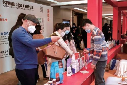 The pet food displayed by exhibitors outside the first China Pet Food Conference attracted many people to stop.